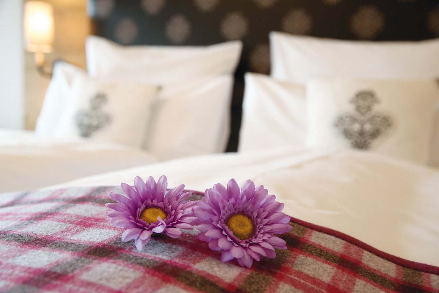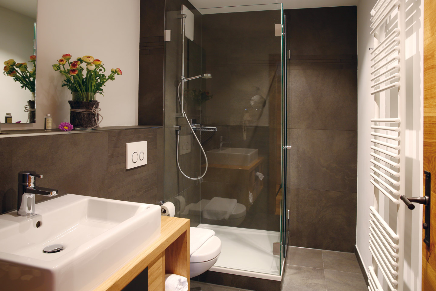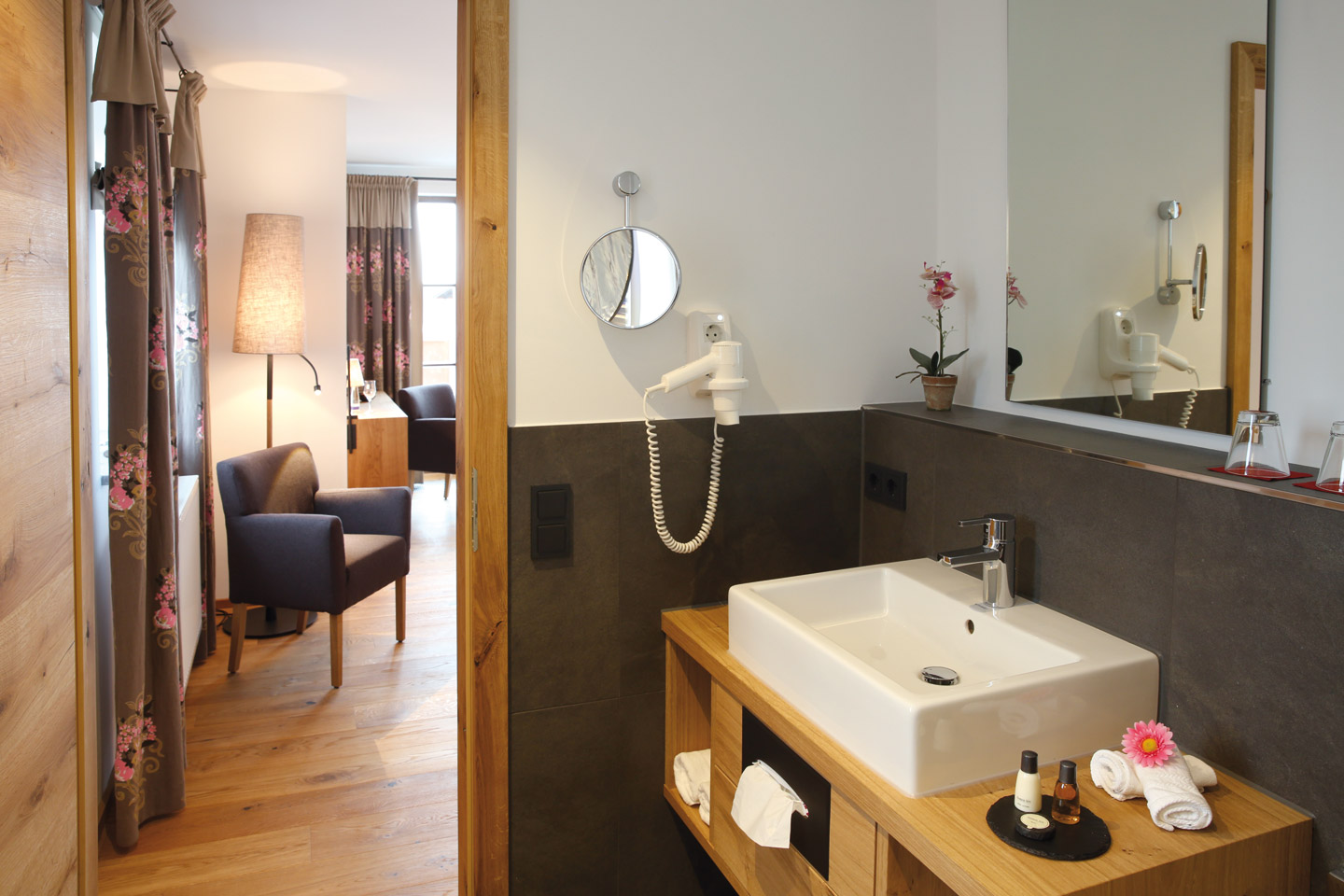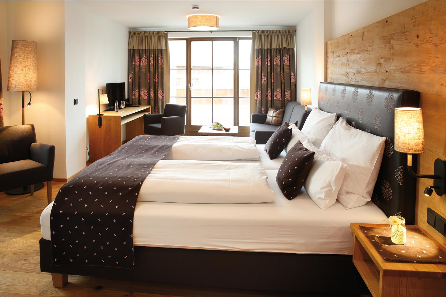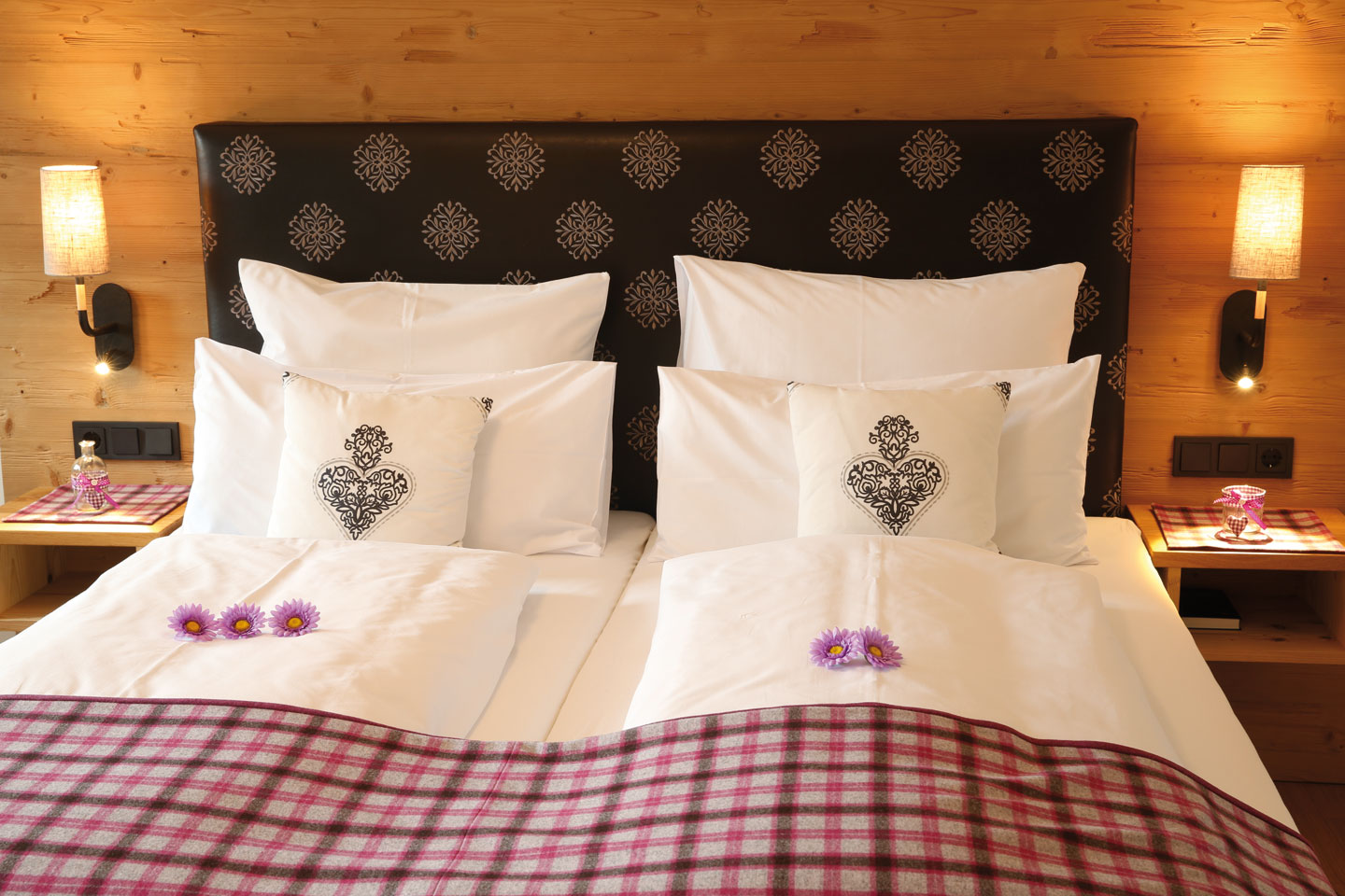 | Kleines Doppelzimmer (Bett 1,60 m), ausgestattet mit Zirben und Fichtenholz, warme Farben und hochwertigen Stoffen | ||