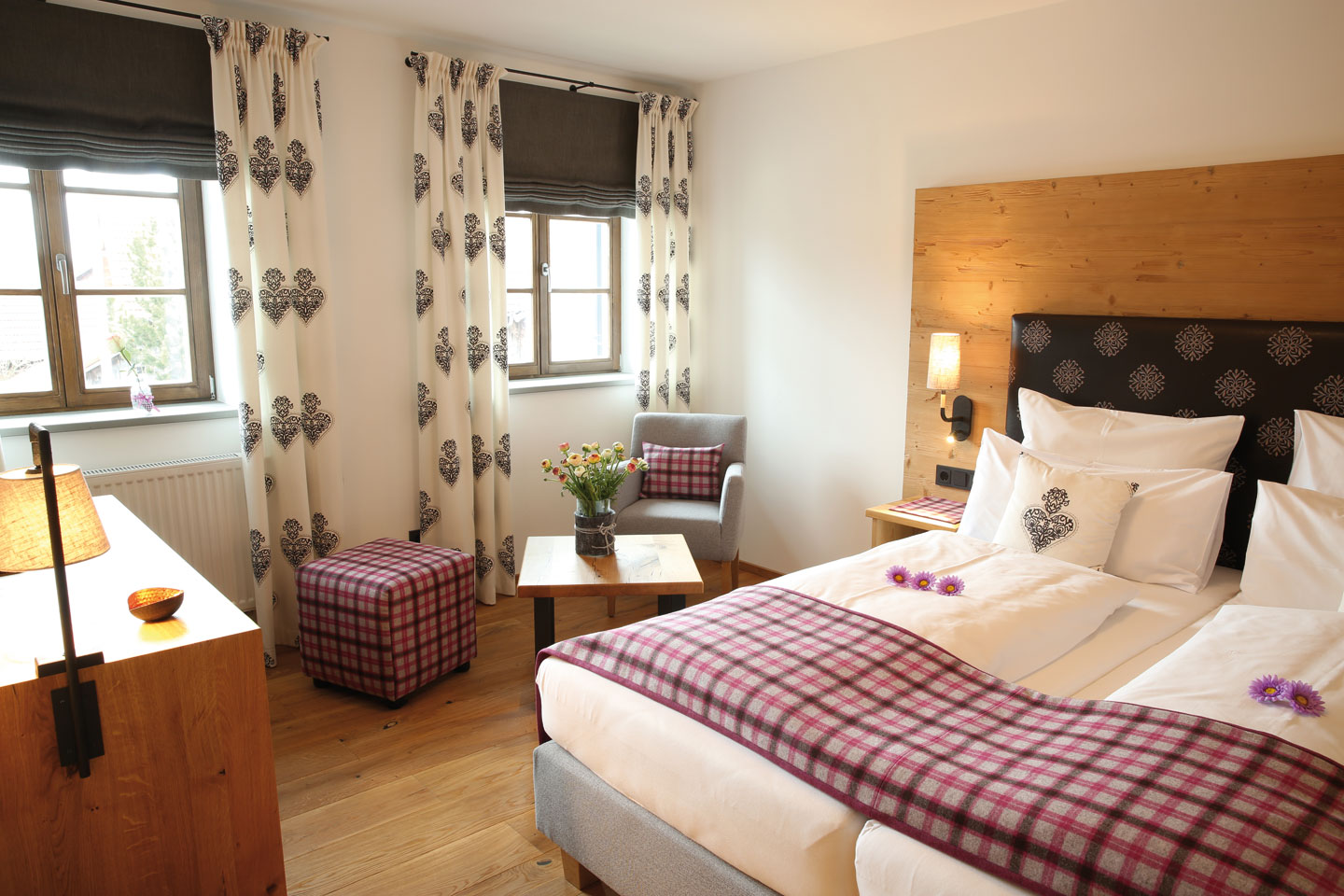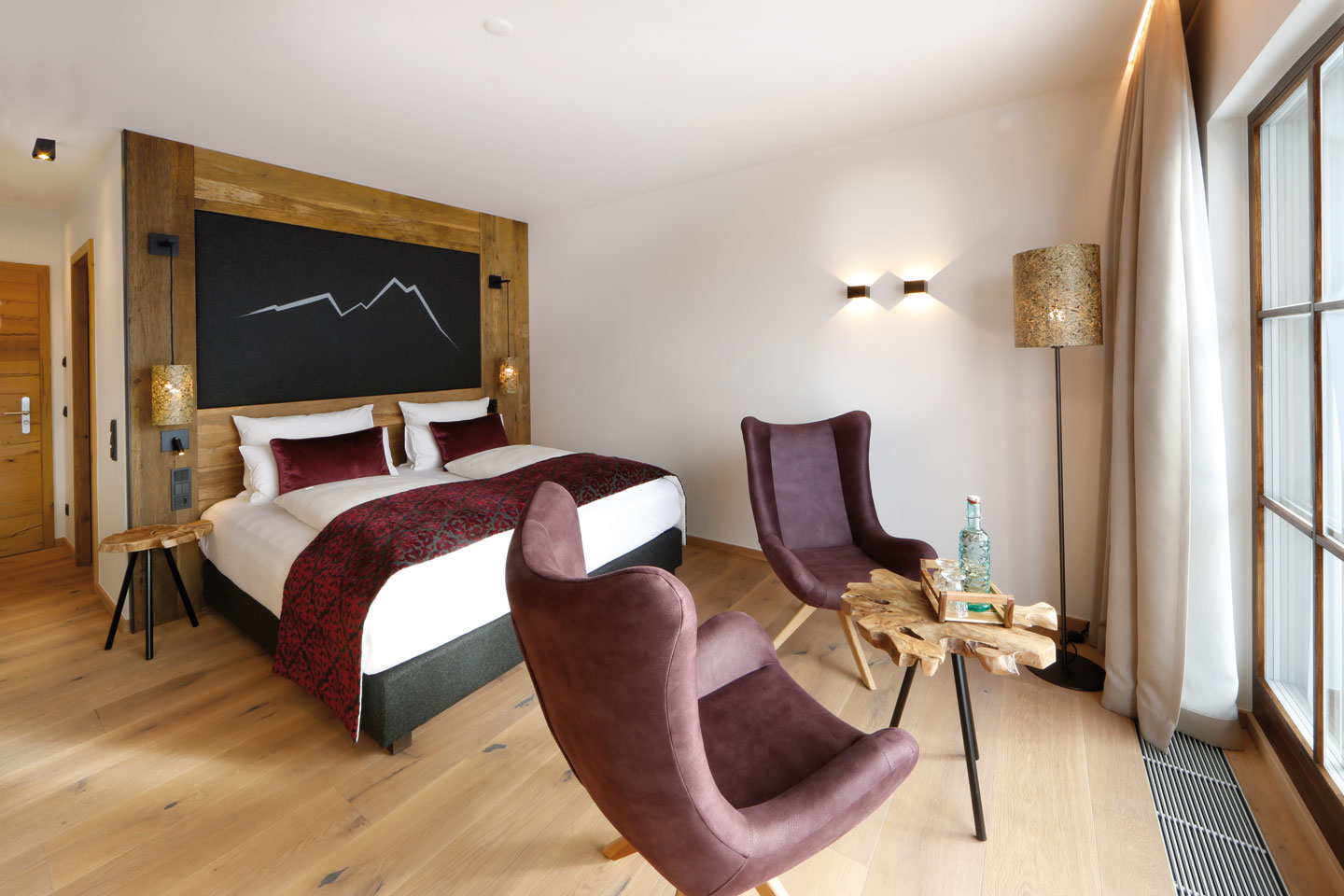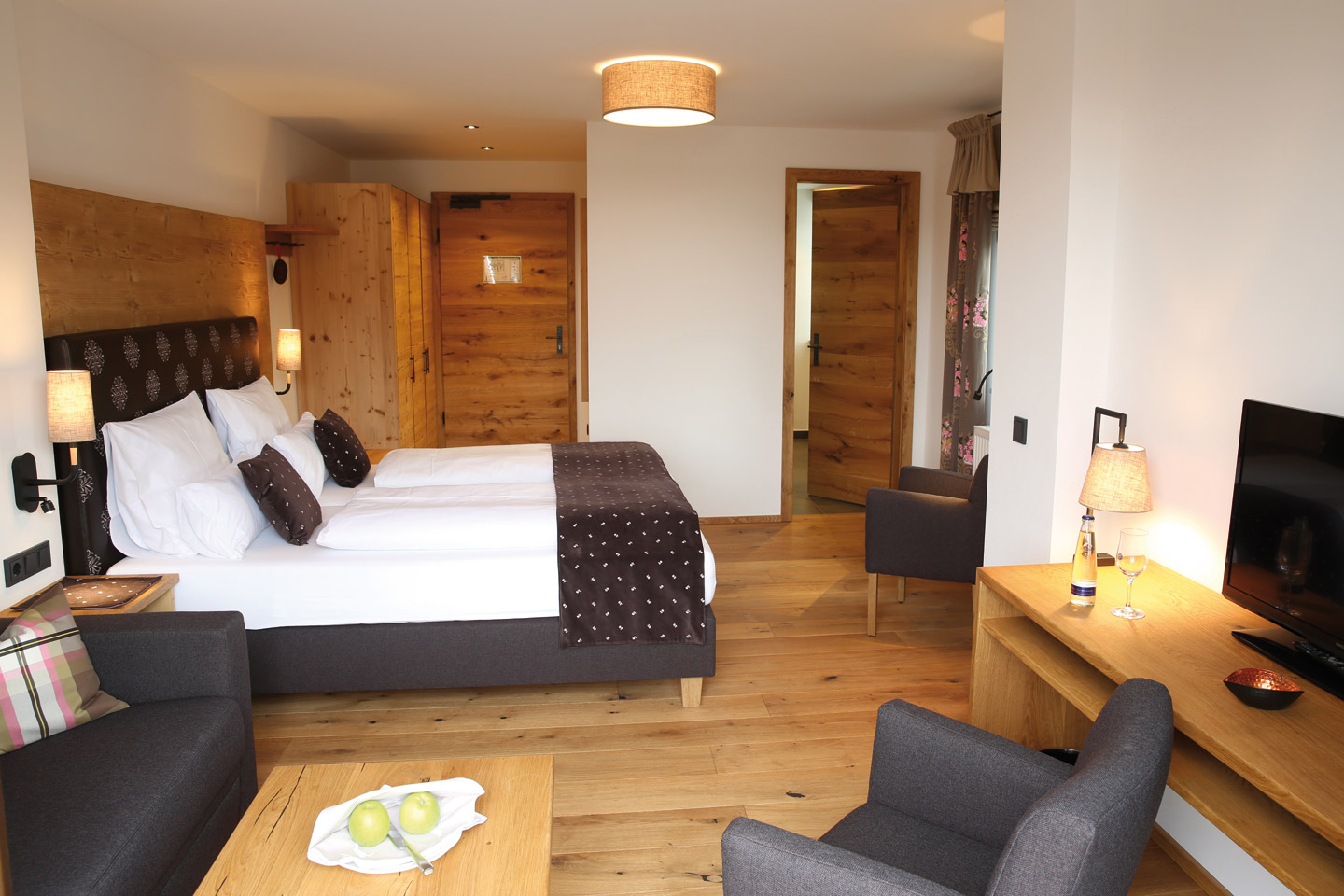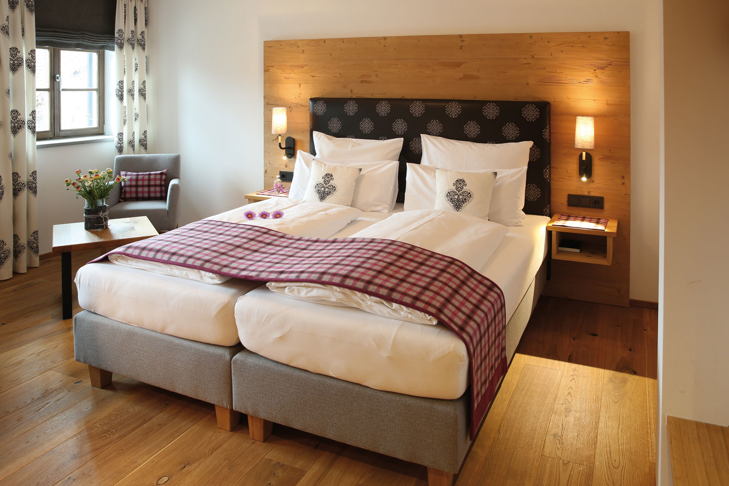 | Ausgestattet mit Fichte Altholz, warme Farben und hochwertigen Stoffen | ||