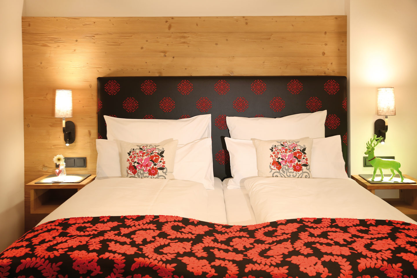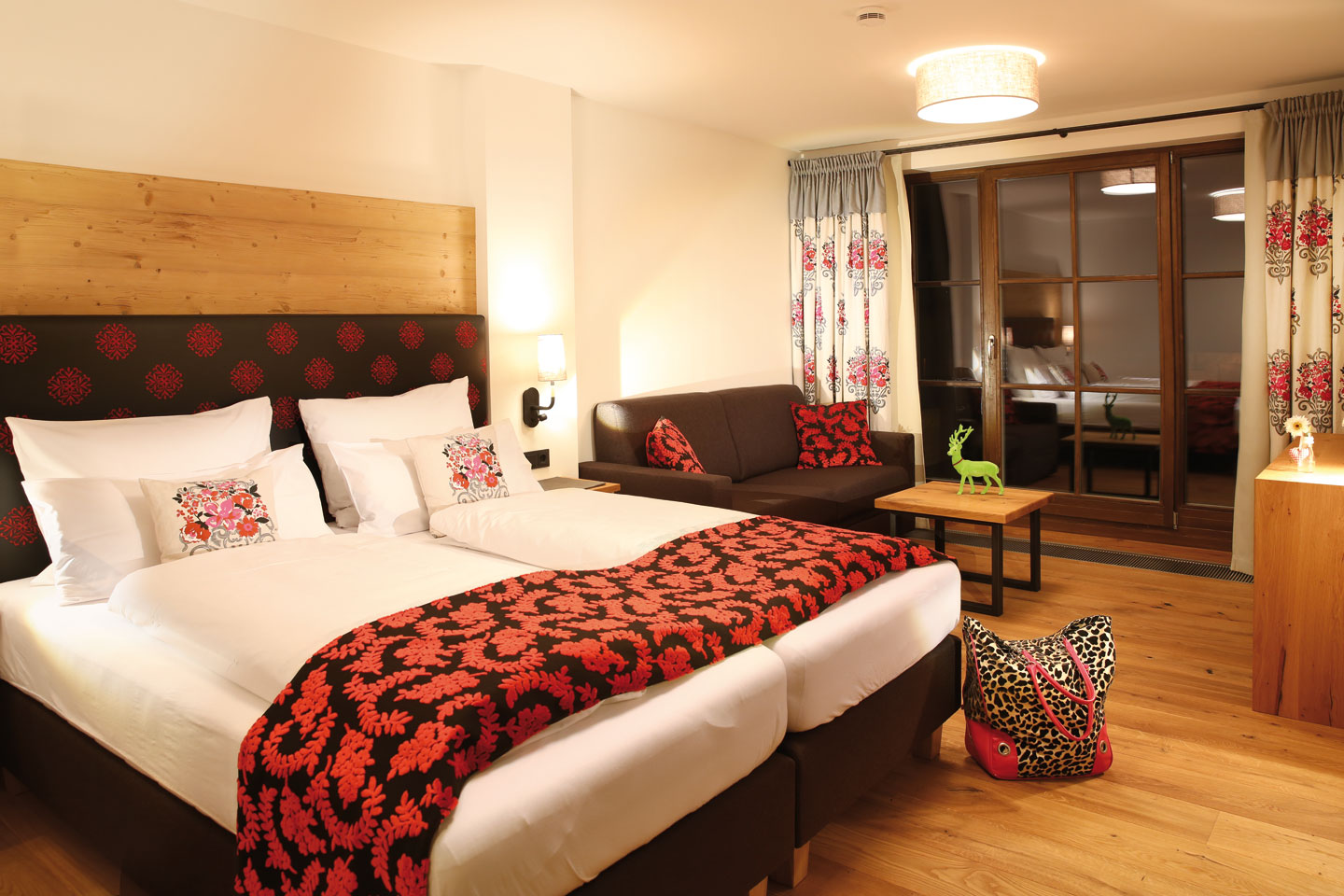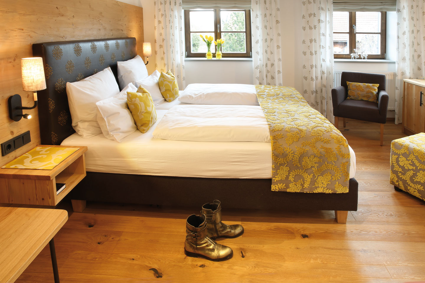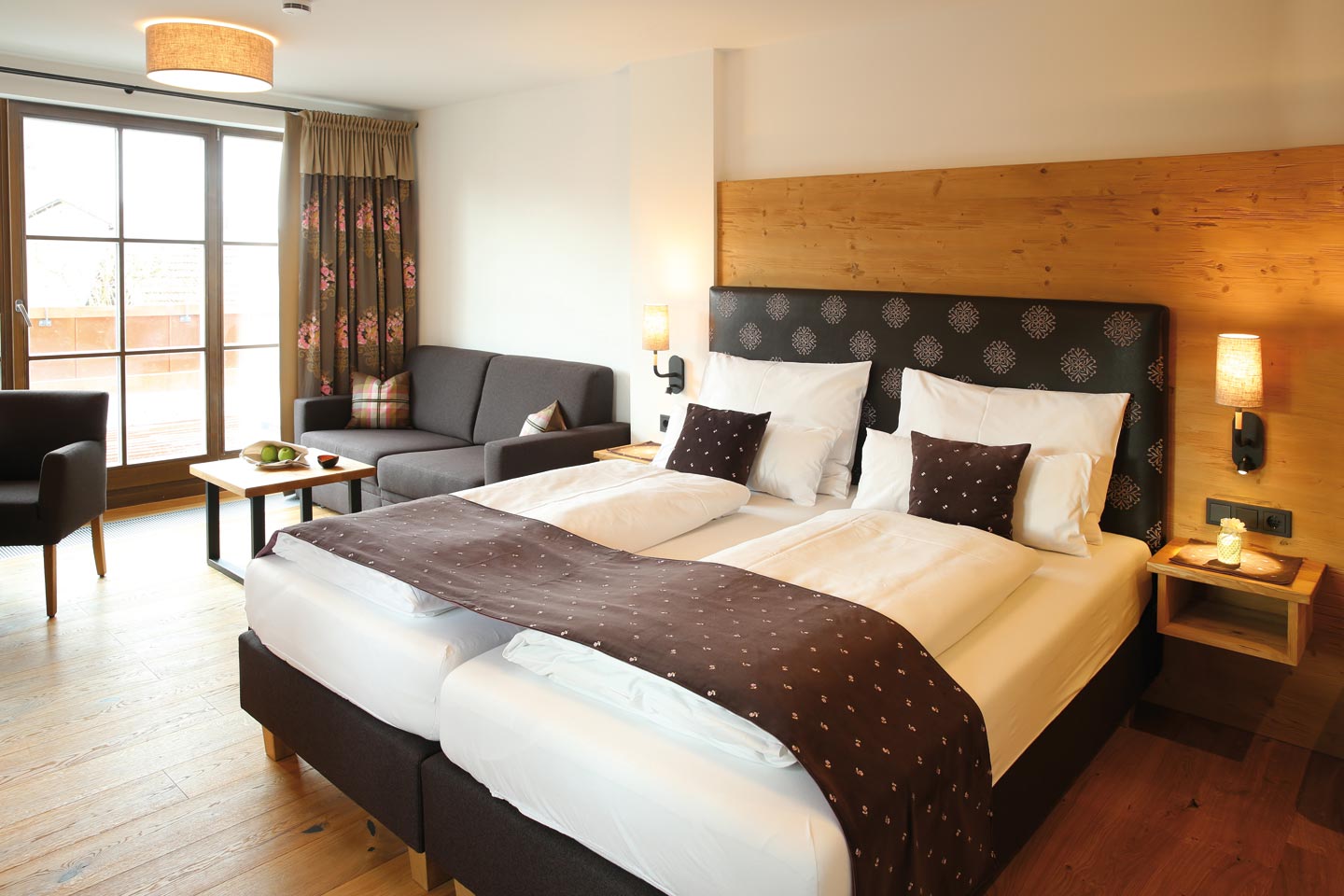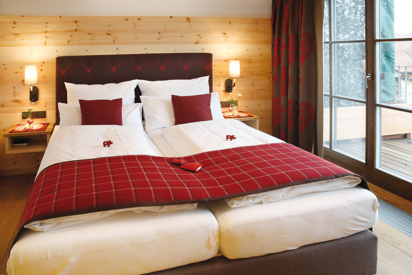 | Ausgestattet mit Fichte Altholz, warme Farben und hochwertigen Stoffen | ||