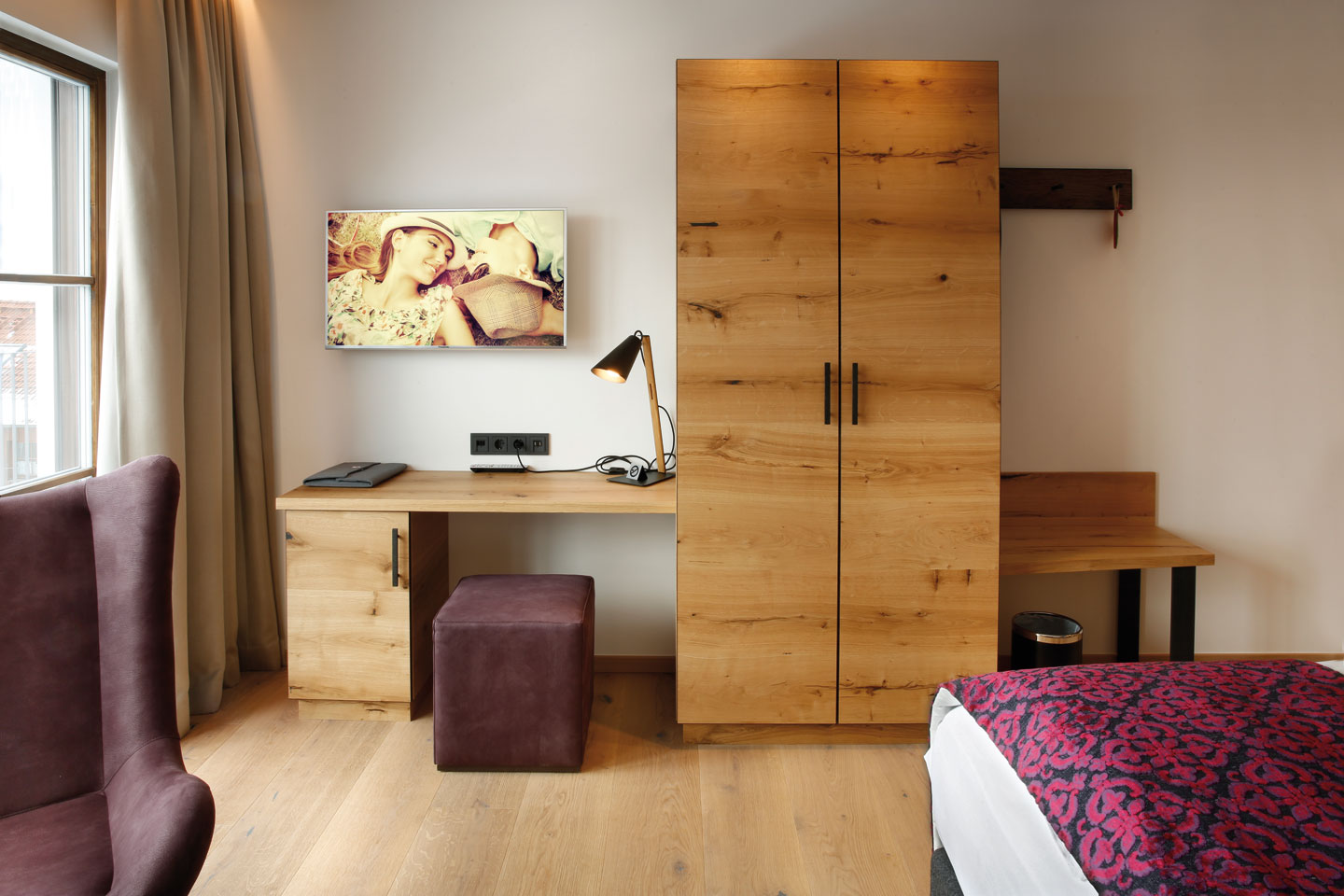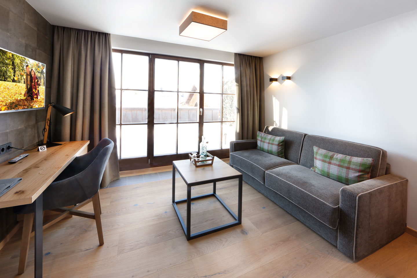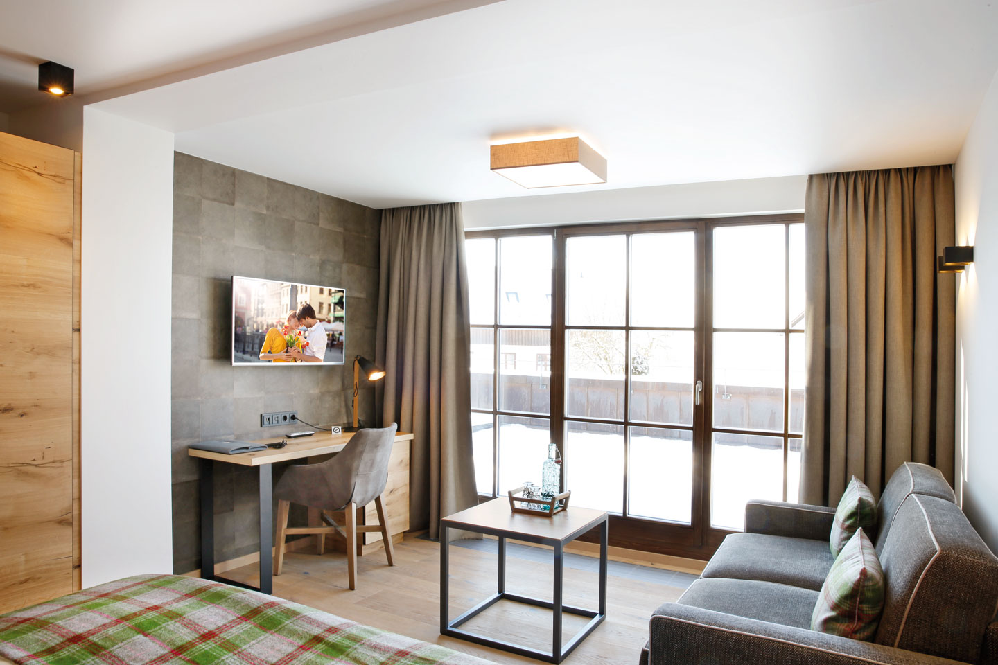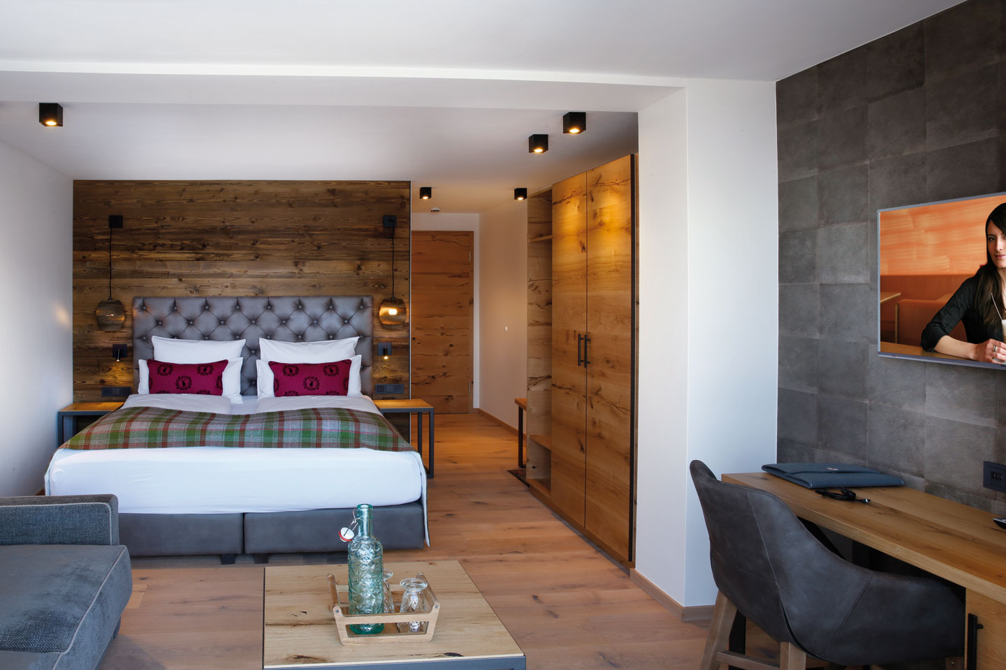 | Ausgestattet mit Fichte Altholz, warme Farben und hochwertigen Stoffen | ||